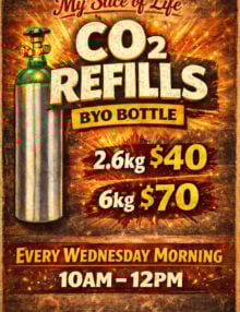 Bring in your own CO₂ bottle for refill. Bottles are refilled Wednesday mornings between 10:00am and 12:00pm. Simply drop your bottle off during the week, and we’ll contact you when it’s ready for collection.