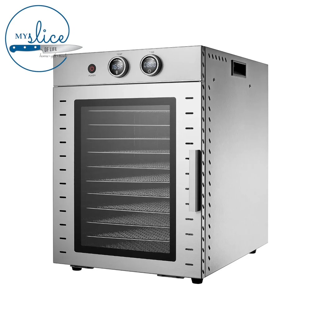 Designed for those who need extra capacity, this stainless steel dehydrator offers both durability and efficiency. The insulated design retains heat for faster, more consistent drying while reducing energy consumption. The tempered glass hinged door allows you to monitor progress without losing heat, ensuring steady temperatures throughout.